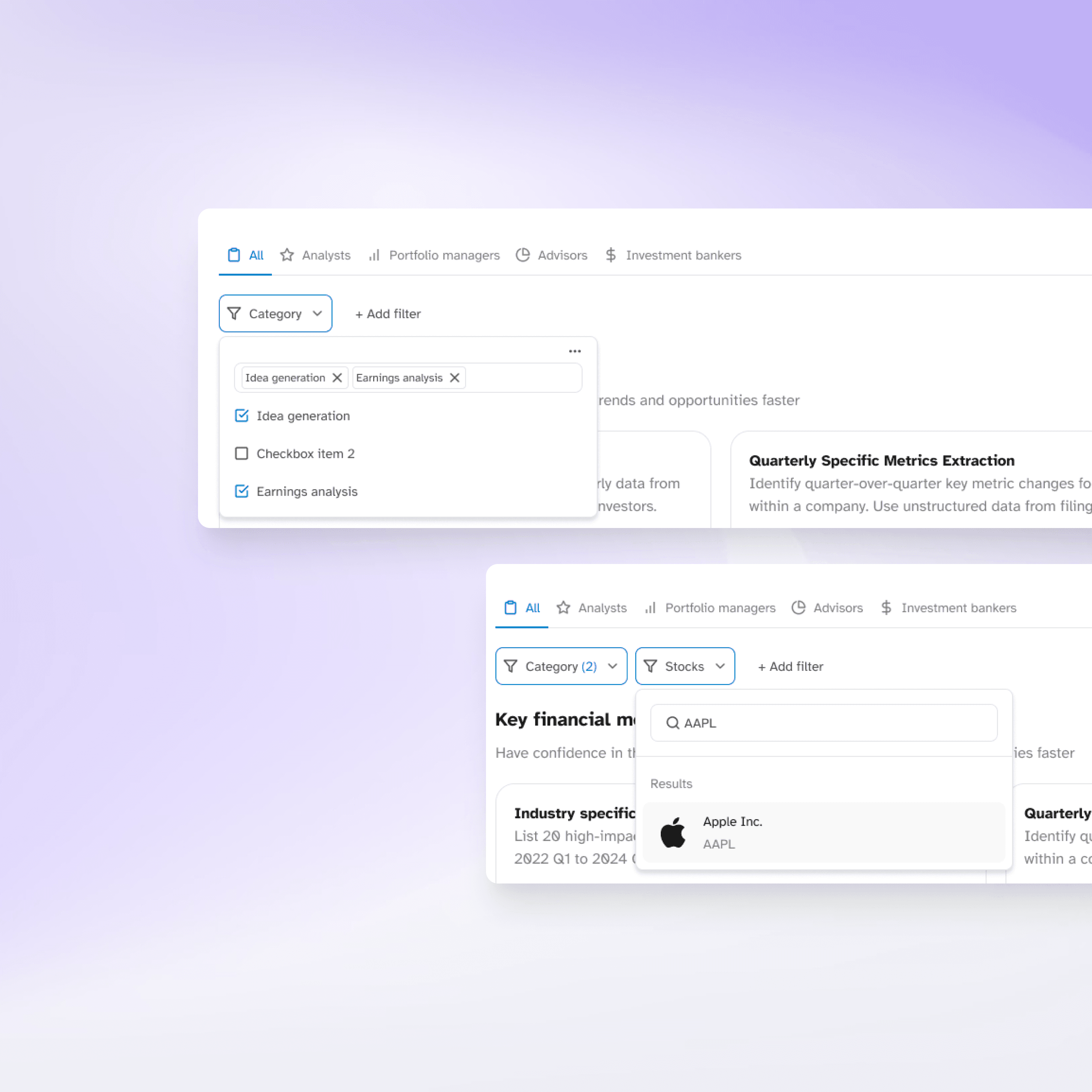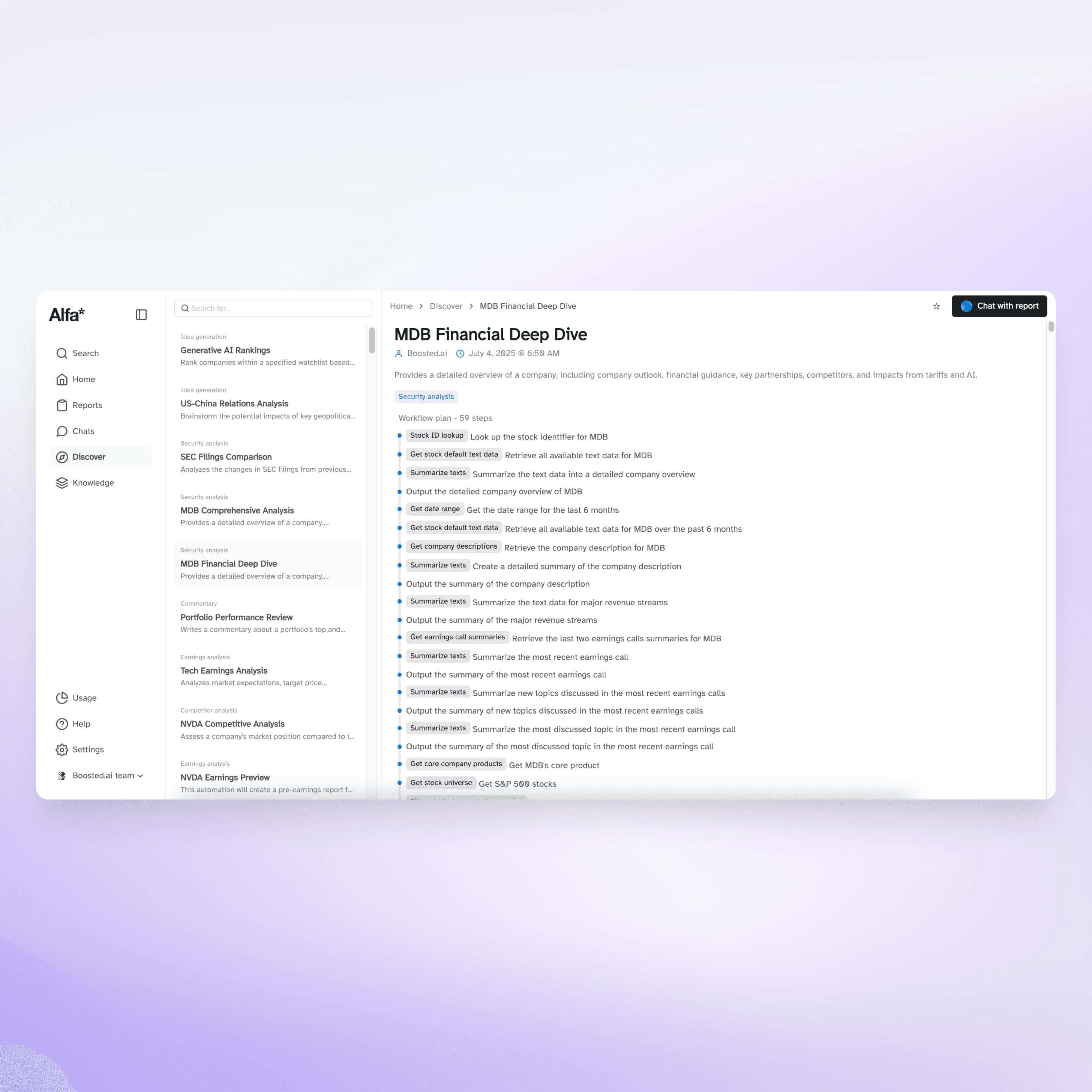 The sheer amount of content that Alfa was offering to it’s content is a direct selling point for users. Reports being ran across different names, indices, and themes was vast but users were having trouble navigating all of it. This project directly addressed this user pain point as well as having the knock-on effect of helping to streamline internal teams abilities to scale agents across many research vectors.