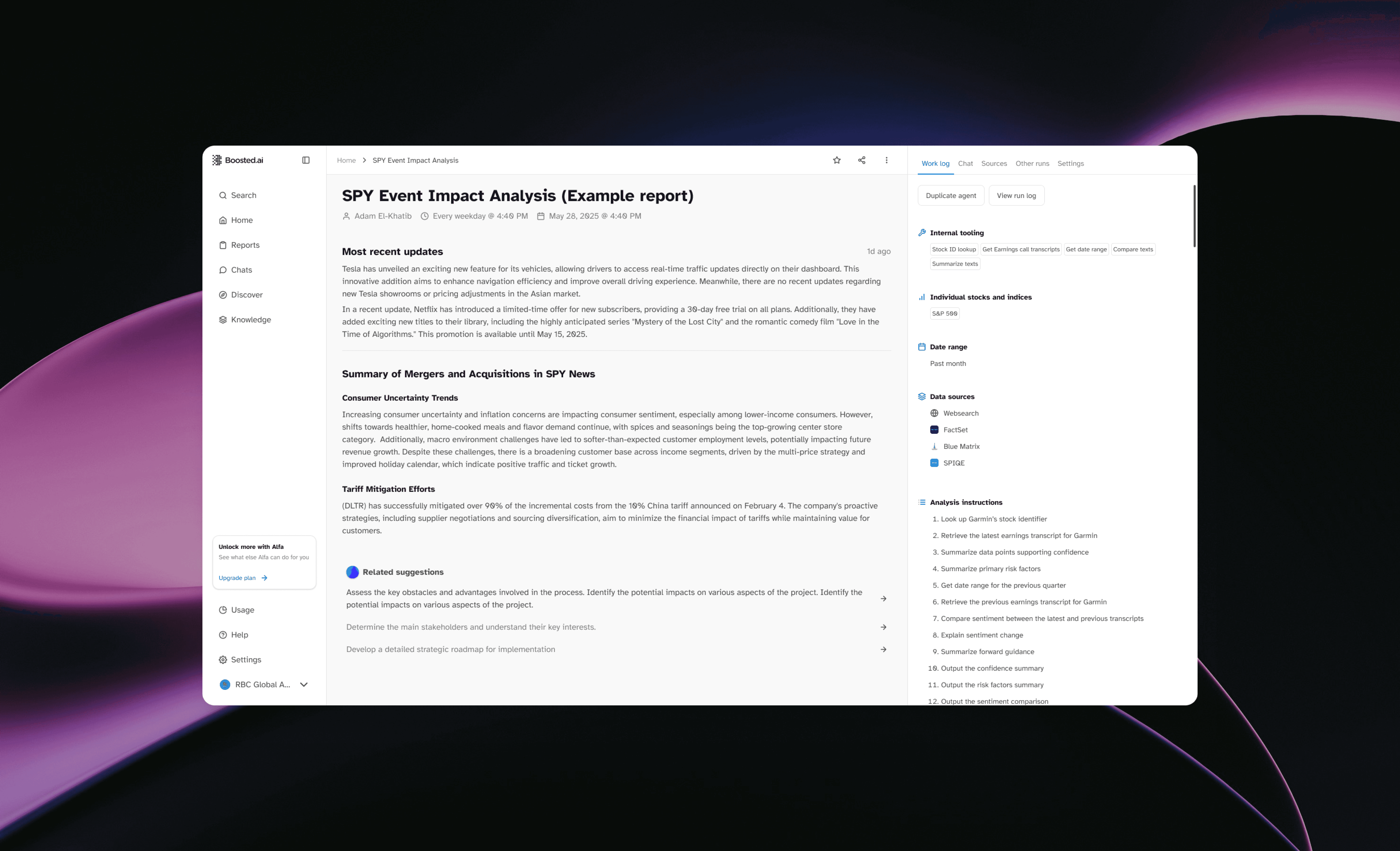 The design incorporates a right hand panel surfacing the discreet inputs represented in plain english that ultimately produced the report in the main content rail. From here a user can duplicate this agent and direct it towards some other object within the Boosted ecosystem.