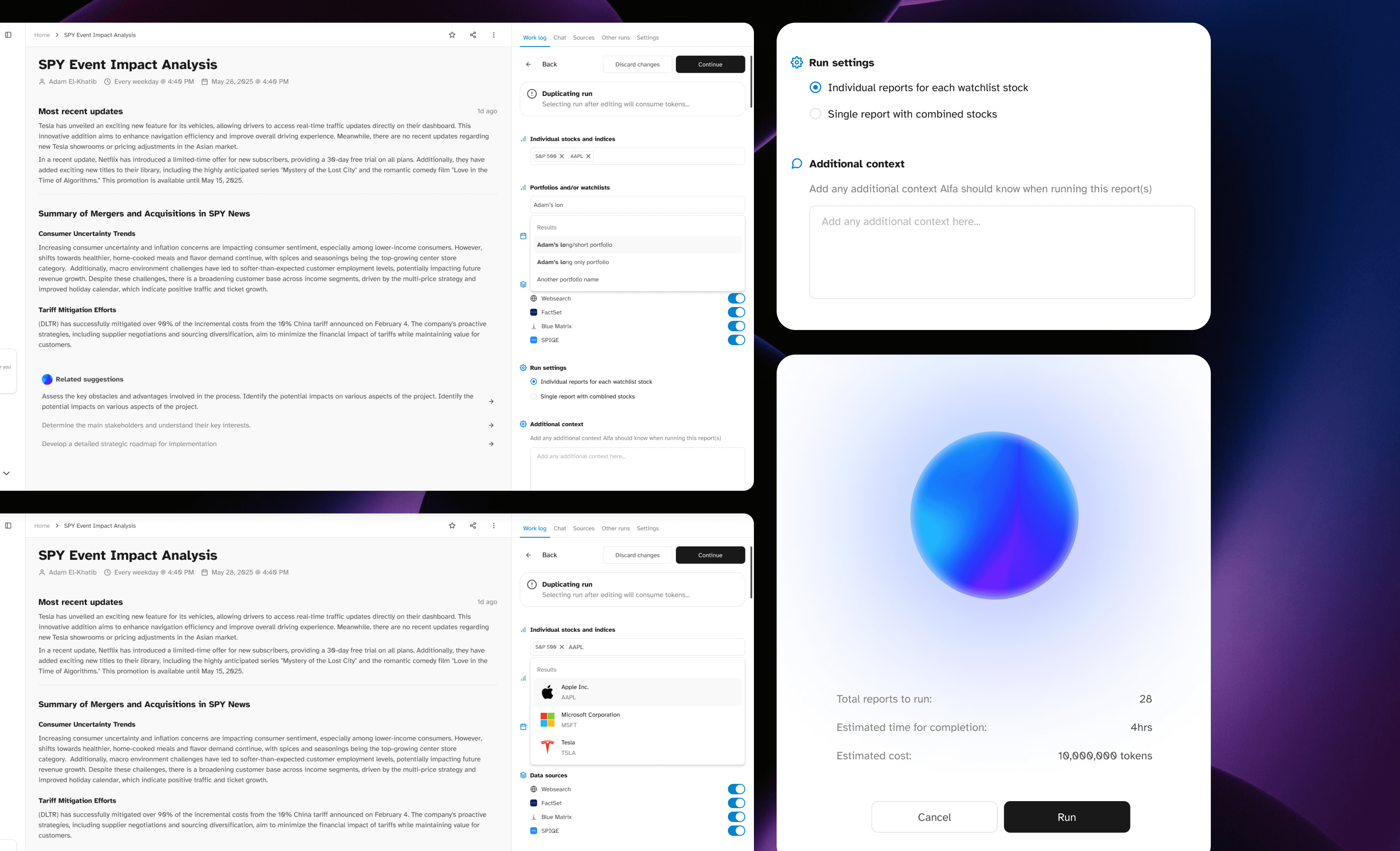 Once a user had modified the inputs they can now choose to run the deep research plan as a single massive report or individual reports across all the different target assets, netting any number of reports ready for consumption.